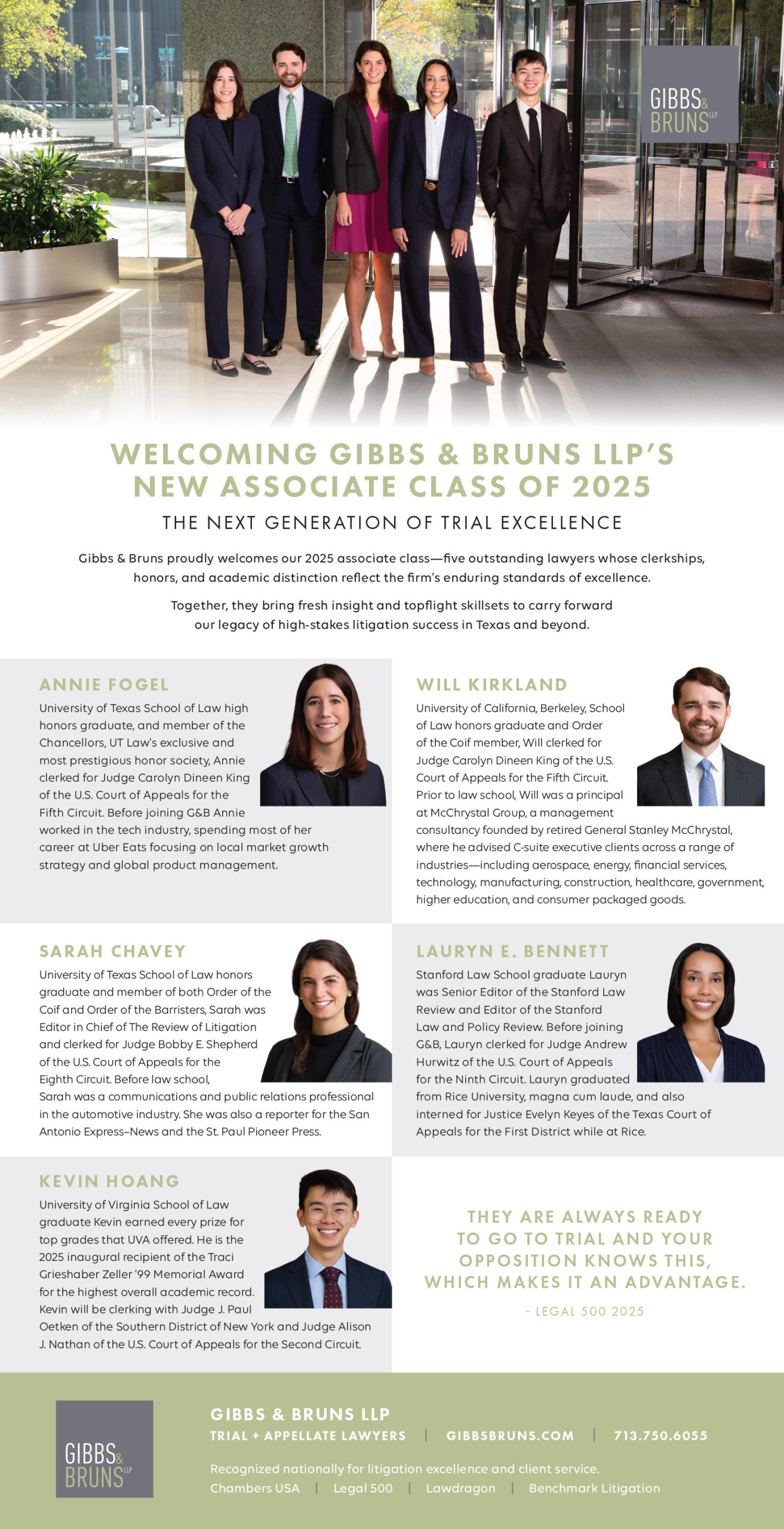 Communication with Gibbs & Bruns LLP through this web site does not constitute or create an attorney-client relationship with our firm or any of its attorneys. Please do not send confidential information via this web site or any email address appearing on this web site. All Gibbs & Bruns clients must clear a conflicts procedure and execute an engagement letter with the firm before information can be freely exchanged with our lawyers. If you provide information before an attorney-client relationship is formally established with our firm, we may not be able to treat that information as confidential or privileged. In addition, we may potentially represent a party directly adverse to you, and the information you provided may be used against you.